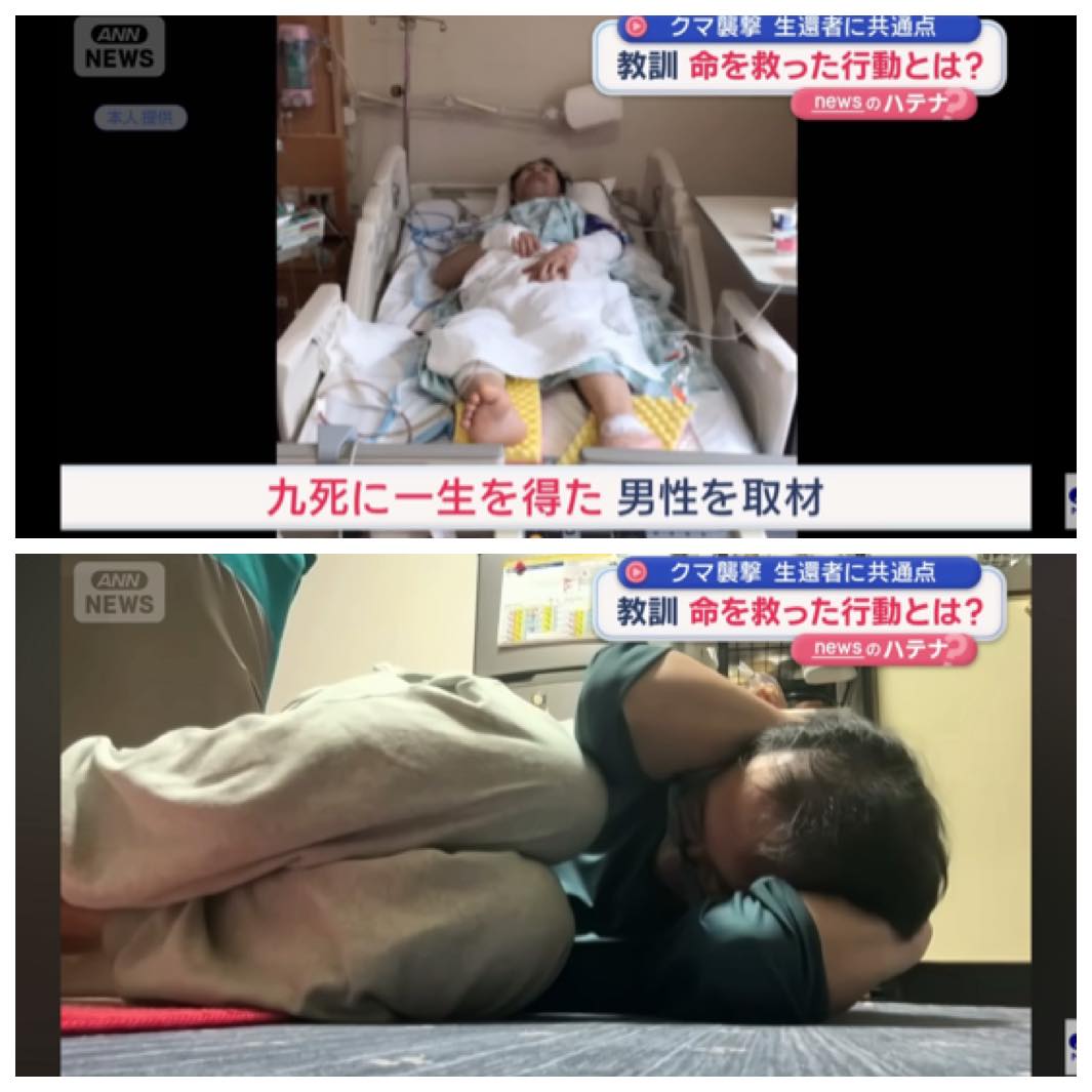 現年47歲的安藤五年前被襲,身體感到劇痛時反射動作把頭一轉,竟跟熊直接大眼瞪小眼;隨機應變下把身體捲成蝦米般,反手十指緊扣護住頸部,大腿跟胸口盡量緊貼保護腹部。安藤的建議是要盡量把身體縮成一團,保護最脆弱的部份。
