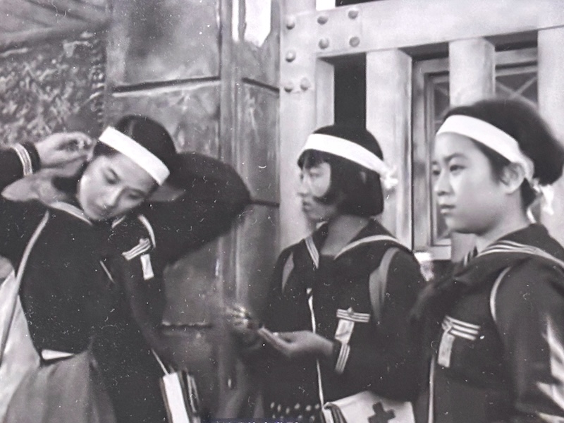 嫁不出去算什麼呢?女孩子們大概還沒想到,未來等着他們的就是死亡。男同學們一一上戰場去了,看見認識的同學、或者不認識的成年士兵們一一倒下來,在戰地醫院裏食物醫藥都不足夠,女孩子們已經忘記自己青春少艾的身份,成為勇敢堅強的女護士,一面唱着「日之丸」歌曲,一面揮動水手服幫助岩洞的通風。