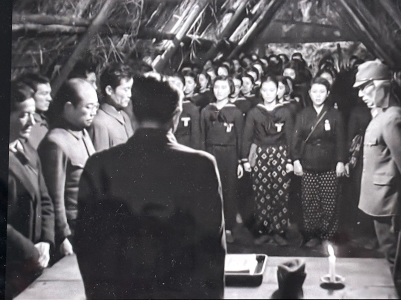 女老師一直陪伴着這些孩子們,在真壁她們短暫渡過了安全的時光。女孩子們開始動搖,不如就舉白布出去,敵人不會對女人開槍。可是士兵們不這麼想,一個女學生要離開防空洞了,首先就被自己人槍殺。也有人開始排放毒藥給走不動的女孩子,讓她們光榮地為國捐軀。