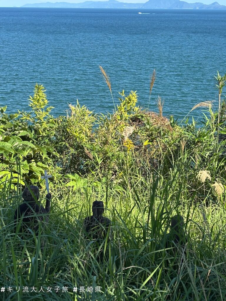 花點腳骨力走上建築在山上的原城,在原城遺址最高點有座白色紀念碑,頂端是個十字架;十字架旁邊是身穿南蠻衣服的天草四郎石像,還有三個傳教士小石像躲藏在十字架後面雜亂草叢中遠望海的彼岸。