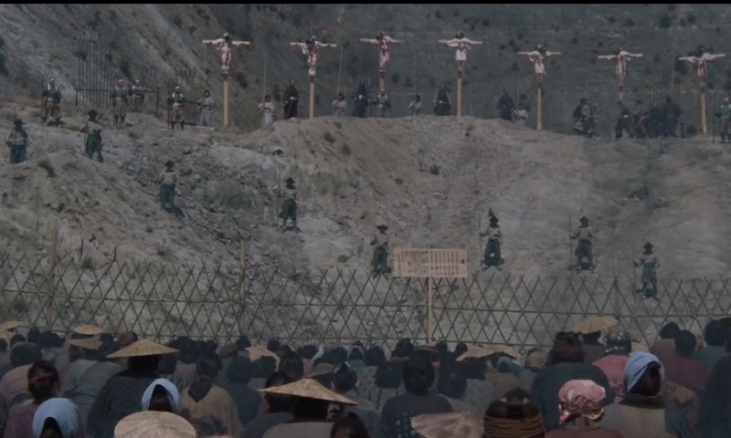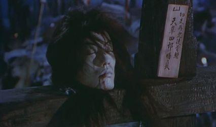 深作欣二的電影開首便是鮮血染紅的土地,幾萬人的屍體堆積如山。這人間地獄冤有頭債有主,全因寬永14年(1637年),松平伊豆守為總大將的幕府軍鎮壓了長崎島原半島的島原之亂,慘殺了大將天草四郎時貞及數萬人的信徒。