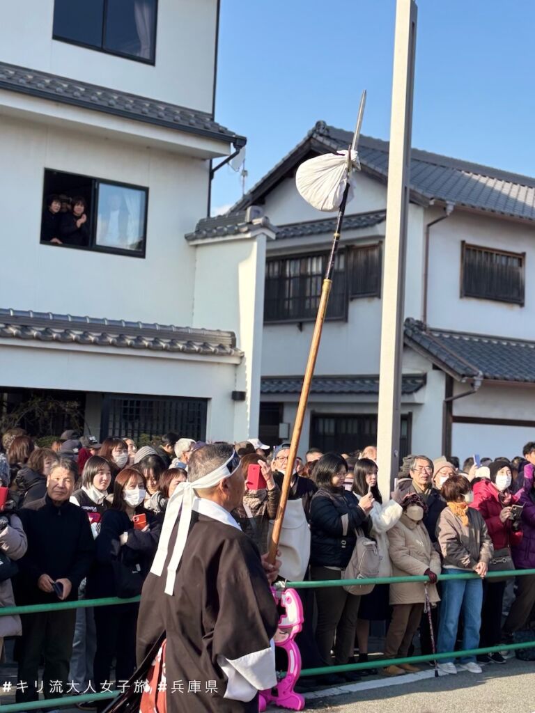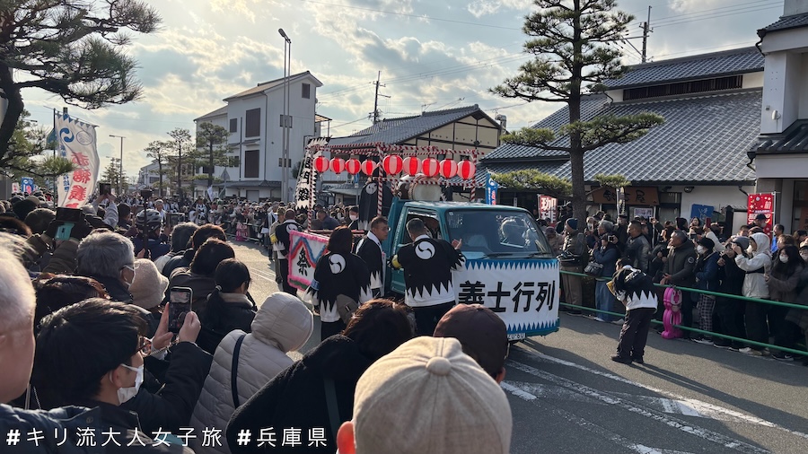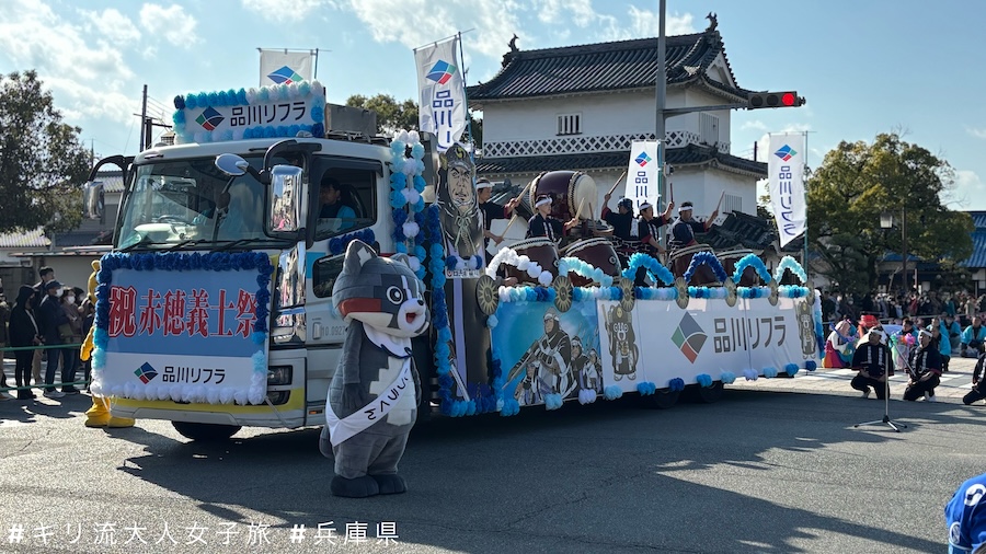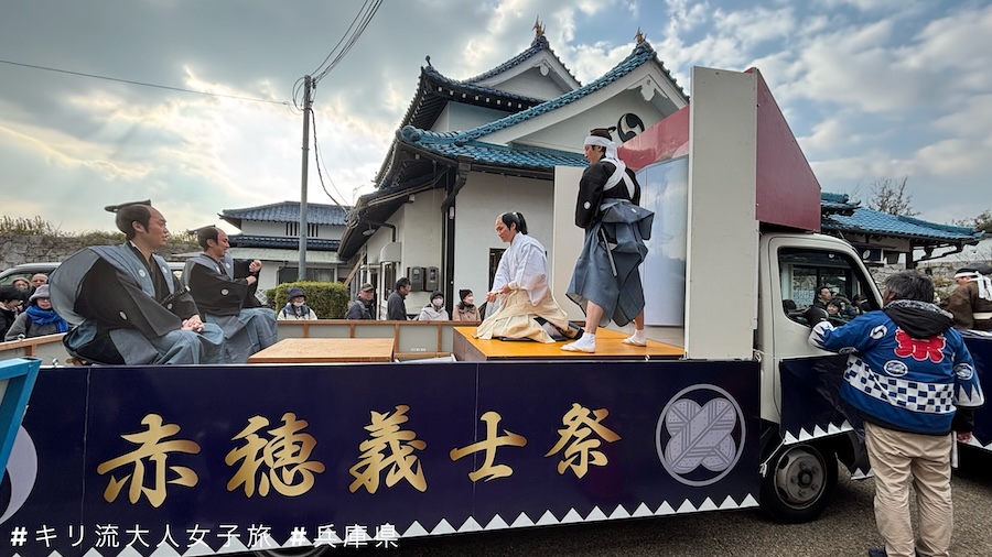 我在花車巡遊前大約半小時開始排隊,終於站在人潮中的第二層。首先是赤穗當地學校及企業的參加者還原忠臣藏個個著名場面的花車,然後是以打鑼打鼓帶領一眾義士討伐吉良上野介的主角大石內藏助(內藤剛志 飾)。