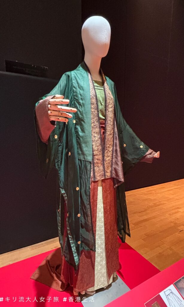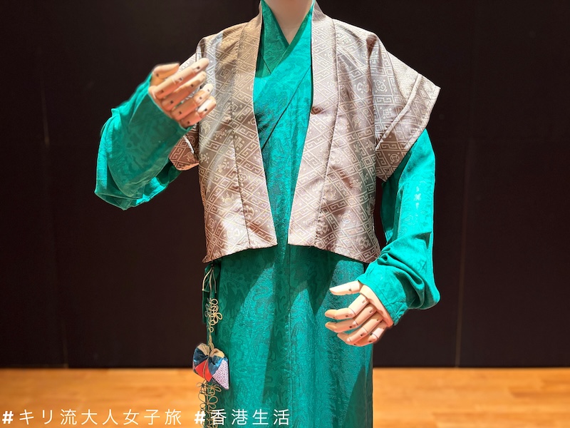 明朝服飾集漢、唐服飾之大成,而又有獨創之處,服飾儀態端莊,氣度宏美;當今中國戲曲服裝的款式紋彩,也多採自明代服飾。展品復原了正德至嘉靖年間,江南一個富庶的世家大族中小侍女的節慶時的裝束。上衣內搭為明代常見的交領琵琶袖衫,綠色絲麻面料,形製上參考的文物包含孔府傳世舊藏和平江明代墓葬出土的紡織品。