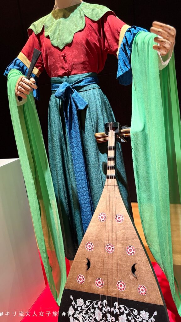石刻浮雕「二十四伎樂」於成都,是迄今考古發現的唯一完整反映唐代及前蜀宮廷樂隊組合文物。浮雕中樂手姿態各異,手持橫笛、箎、琵琶、排簫、鼓等樂器,展現了宮廷燕樂(宴樂)瑰麗場景。展品結合當時服飾的結構基礎,透過觀察浮雕形象後設計:廣袖衫沒有採用常見的晉制交領接襴,而是參考了唐代時期多個壁畫以及考慮了演奏的便捷性後,選擇了圓領對襟;雲肩沒有採用清代雲肩金屬子母扣,而是使用更符合當時的系帶。