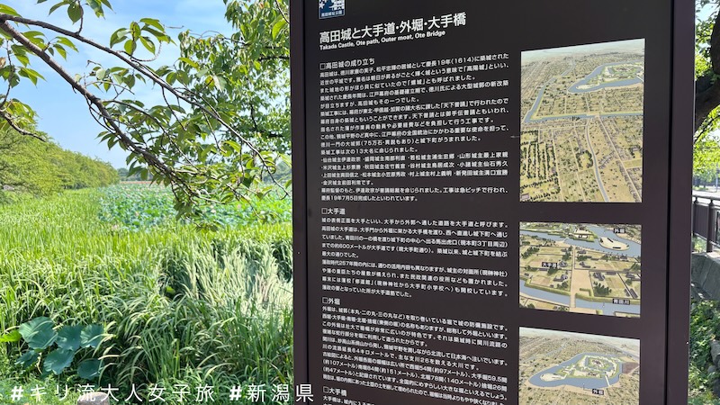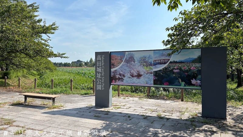 高田城址的荷花種植位置,就在已不復存在的高田藩內。想當年慶長19年(1614年),德川家康六男松平忠輝奉命築高田城,建築物樣式為大規模的近世平城。築城地點選在高田平原的菩提原地區,利用周邊河川構築本丸、二之丸、三之丸與護城河,形成防禦性很強的城郭布局。當時有份參與天下普請築城的名人有出羽米沢城主上杉景勝、加賀金沢城主前田利常、奧州仙台城的伊達政宗,真是星光熠熠,人才鼎盛!