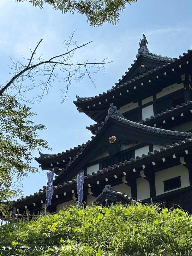講個煞風景的事實:這水中倒影三重櫓在夜櫻或夜間點燈時與水面倒影構成讓人感動不已的,景觀,實際並無任何歷史價值;雖然它是高田城最大的建築,卻是1993年外觀仿江戶時代樣式重建的三重櫓。真正的本丸御殿和三重櫓,老早在1870年已經因火災燒掉了。而現在看到的登城用的極樂橋,更是2002年才興建的。