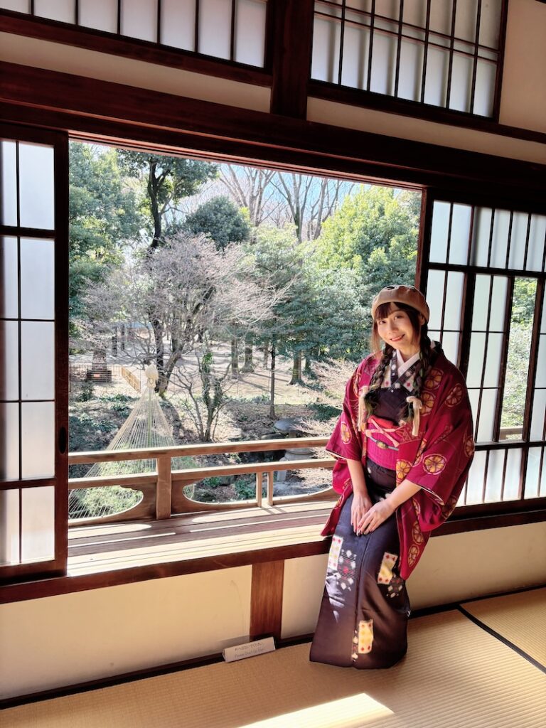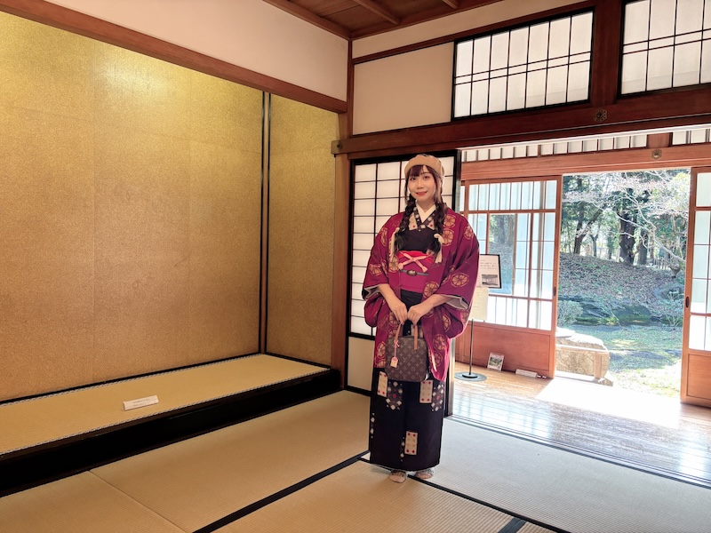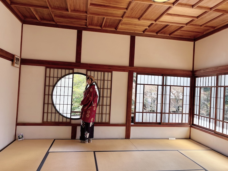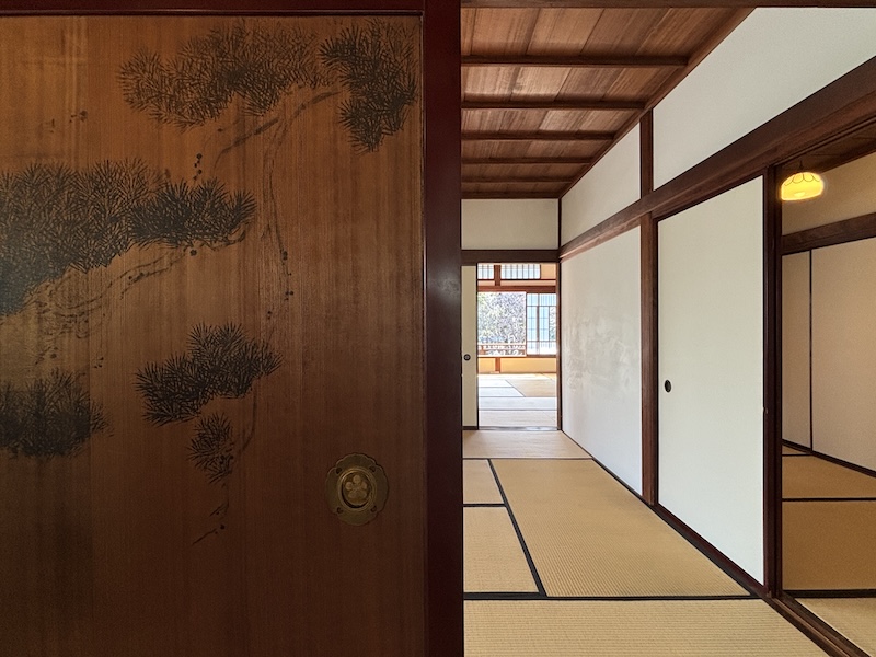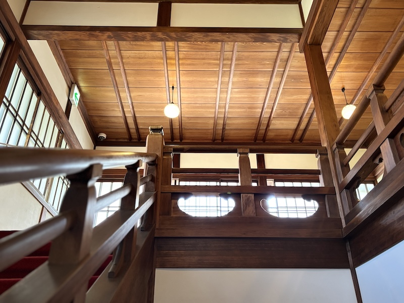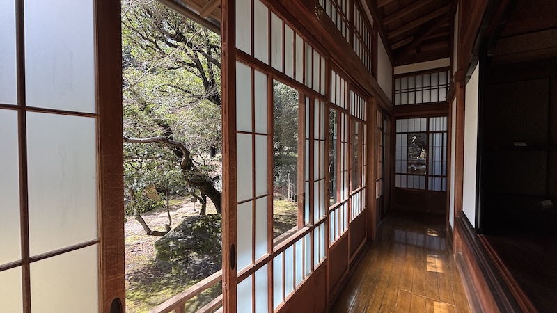 杉戶上畫家橋本雅邦所繪的松竹梅等圖樣經歷歲月洗禮依稀可辨,雖然是和館但2樓配置了德國製造的馬桶。庶民如我能從圓窗眺望庭園與煎茶室一飽眼福,幸甚。
