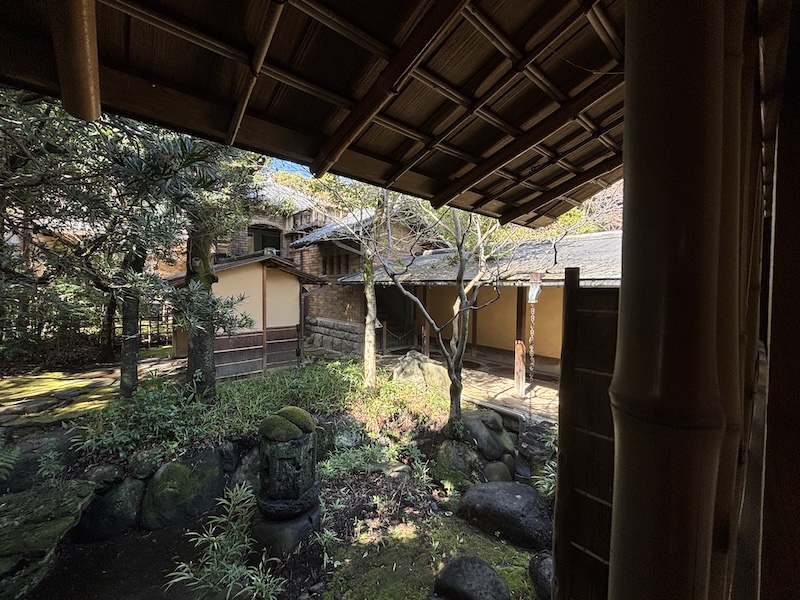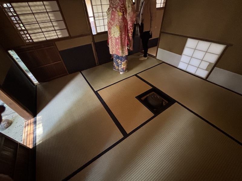 導賞團領隊帶領我們進入平常不開放的院內茶室,據說美國人在宅第居住時,由於身形高大,不能使用原本的小入口,必須從另一扇門進入。從茶室望出庭園可見朝鮮式石燈籠,整個宅大共有20來個石燈籠,形態各異。