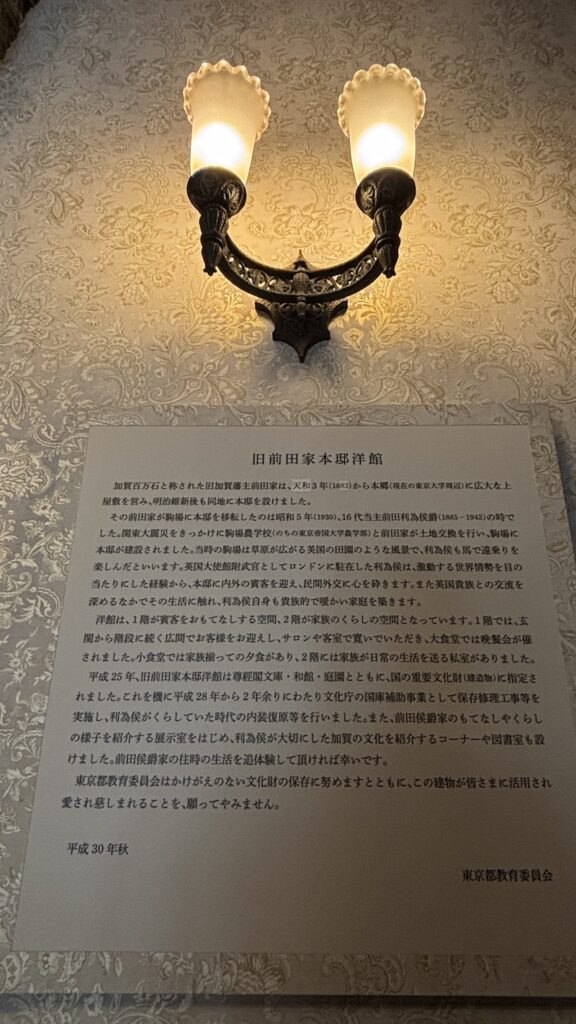 大正15年,這位曾經在英國擔任武官的候爵決定從本鄉搬遷到駒場的本宅,基本計劃是塚本靖,洋館設計由高橋貞太郎擔當、和館則由佐佐木巖次郎負責,而茶室由木村清兵衛操刀。由於前田利為曾駐英任武官,建築的細部裝飾帶強烈英倫審美,並非簡單的西洋模仿。