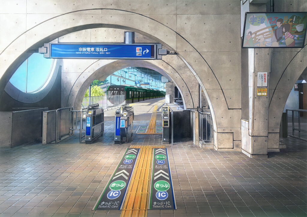 原來宇治川沿岸/府立宇治公園是動畫中放學後坐著聊天的長椅、河邊散步鏡頭,因此原畫的展示也放在此處。至於動畫開頭與通勤場景頻出京阪宇治站,當日雖然未有任何展示品,但是在數十米之距離的「お茶と宇治のまち歴史公園」內的交流館「づな」原來也有女主角們的立牌。