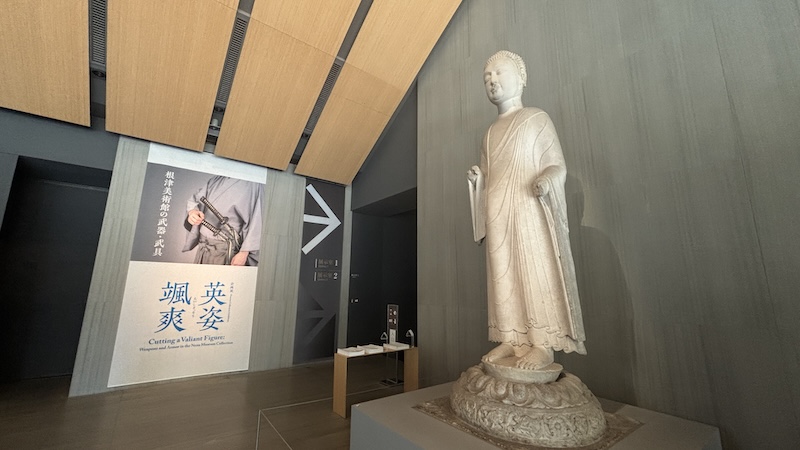 當日恰逢期間限定特展「英姿颯爽」,展出實業家光村利藻的私人日本刀劍與武具收藏,這批藏品1909年被根津嘉一郎整批購入,得以完整保全。展區的燈光調節頗為用心,光線強弱恰到好處,既讓觀者清晰欣賞刀身線條、地肌紋理與鎏金鏨刻的刀裝細節,又能最大程度減少光線對文物的損耗,足見館方的文物保護考量。