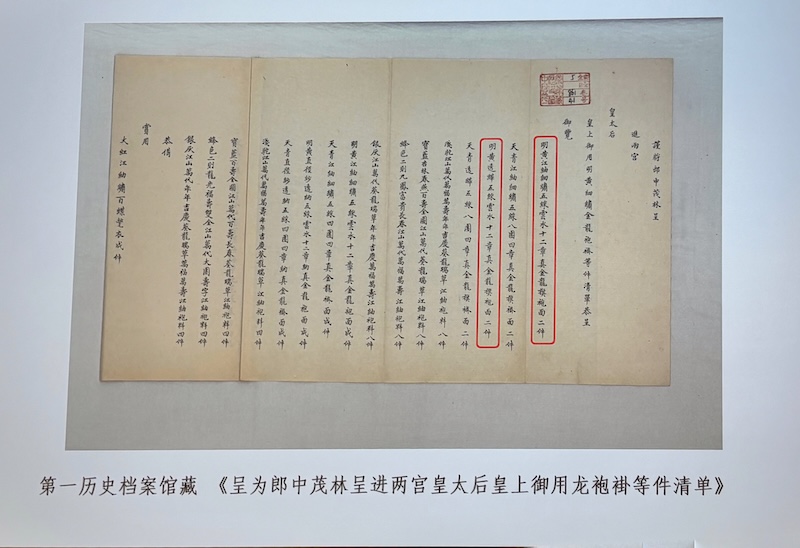 有一份年代相去不遠的奏案也提到了旗袍,並且將旗袍的穿著者指向了慈安、慈禧這兩宮的皇太后。這份奏折的成文時間是同治十一年(1872):《為郎中茂林呈進兩宮皇太后皇上御用龍袍褂等件清單》,由題目可知清單內物品的使用者為兩宮皇太后,清單中包技「明黃江綢細繡五彩雲水十二章真金龍旗袍面二件」、「明黃透緙絲五彩雲水十二章真金龍旗袍面件」。