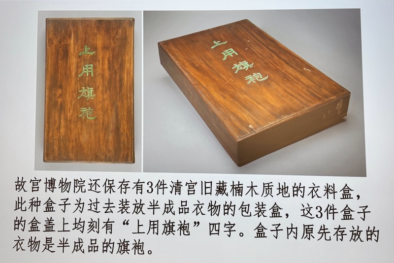 故宮博物院還保存有3件清宮舊藏楠木質地的衣料盒。此種盒子為過去裝放半成品衣物的包裝盒,這3件盒子的盒善上均刻有「上用旗袍」四字。盒子內原先存放的衣物是半成品的旗袍。