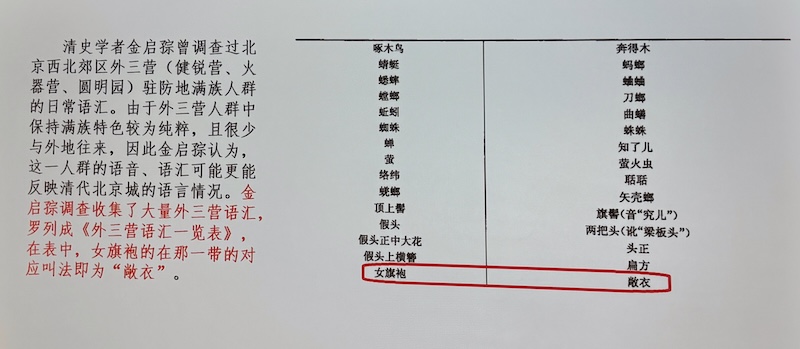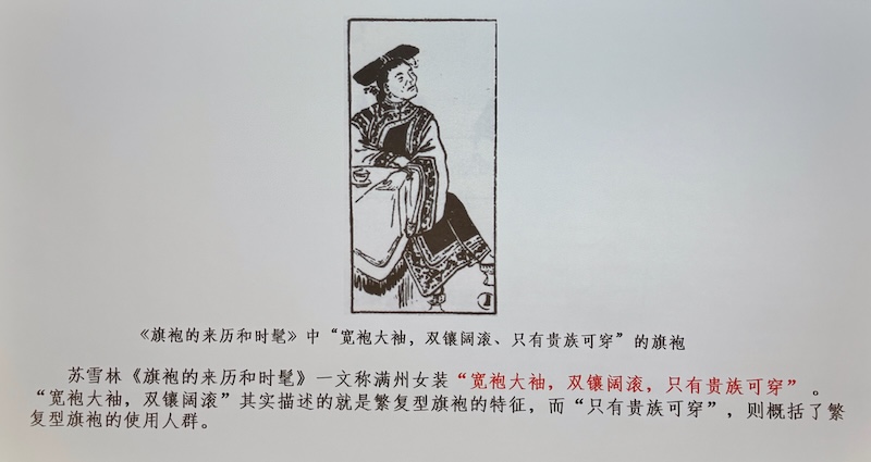「使用「旗袍」來指稱旗人之袍我們所見較早的例子是《雪宦繡譜圖說》,此書作千1918年出版,口述者沈壽和記錄者張賽都是漢人。」