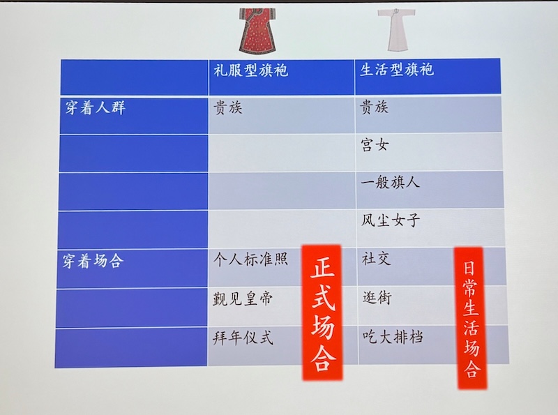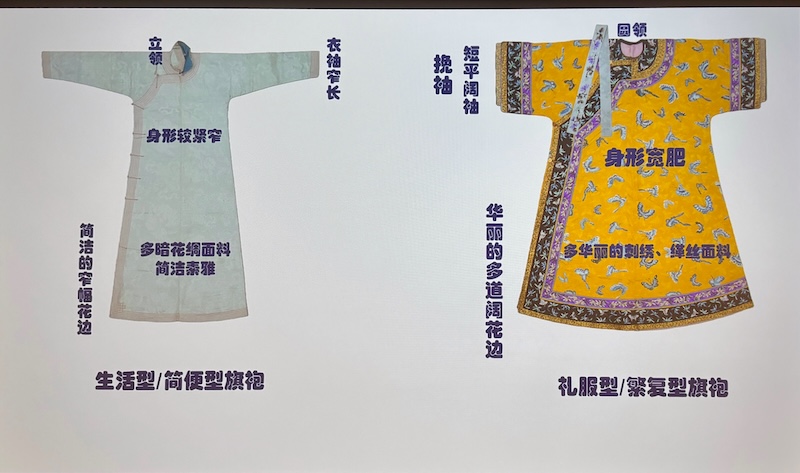 旗袍不論襯衣還是氅衣,依據器物特徵,皆可分為禮服型/繁復型旗袍和生活型/簡便型兩種型,這兩種型有不同的特徵、使用人群和使用場合。禮服型/繁復型旗袍裝飾華麗,一般為上層旗人在重要的禮儀場合使用,雖然是便服,但是已經被當作禮服使用;生活型/簡便型旗袍裝飾相對簡單,為上層旗人和下層旗人日常生活中穿著,仍然承擔便服的職能。