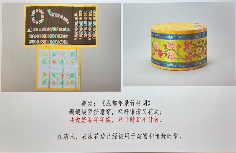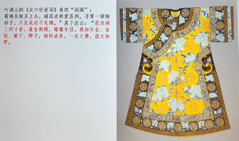 「至於婦女衣裙,則有琵琶、對襟、大襟、百襇、滿花、洋印花、一塊玉等式樣,而鑲滾之費更甚,有所謂白旗邊,金白鬼子欄桿、牡丹帶、盤金、間繡等名色。」