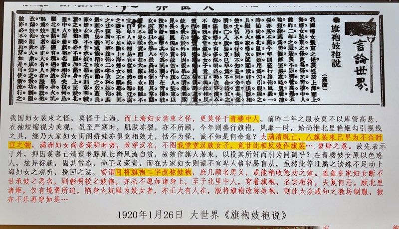 目前雖然暫無法找到此《游滬筆記》中的文字,但從目前留下的清末報紙的商業廣告、新聞觀之,《上海婦女服裝滄桑史》中引用的這段文字所描述的現象似乎是存在的,旗袍確曾於清末光緒年間在上海甚至江南地區傳播過。
