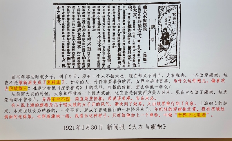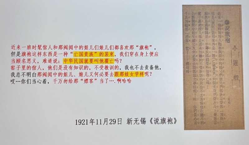 「事實上,以當時上海的新聞界對社會現象敏感程度,一種新式樣的風行必然會引起廣泛的關注;但是在1925年5月以前的如《申報》等報紙上很難查到有關於旗袍的文字,而大量資料為旗袍在1925年的出現提供了佐證。因此,將旗袍流行的起始時間視為1925年當為合理。」