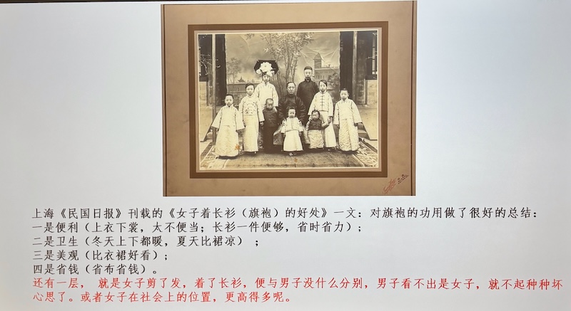 「光緒十四年出版之《游滬筆記》中,有下列一段的記載:『洋涇浜一隅,五方雜處,服色隨時更易⋯女則間效滿洲裝束,殊覺耳目一新。』然則六十年前,上海女裝已有旗裝,但不過偶一嘗試罷了。」