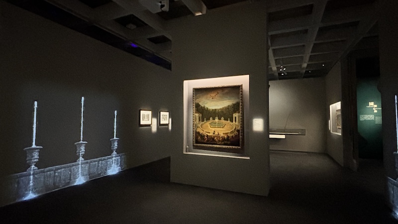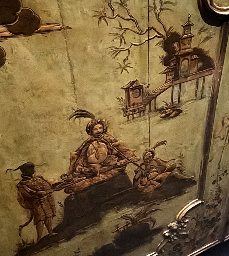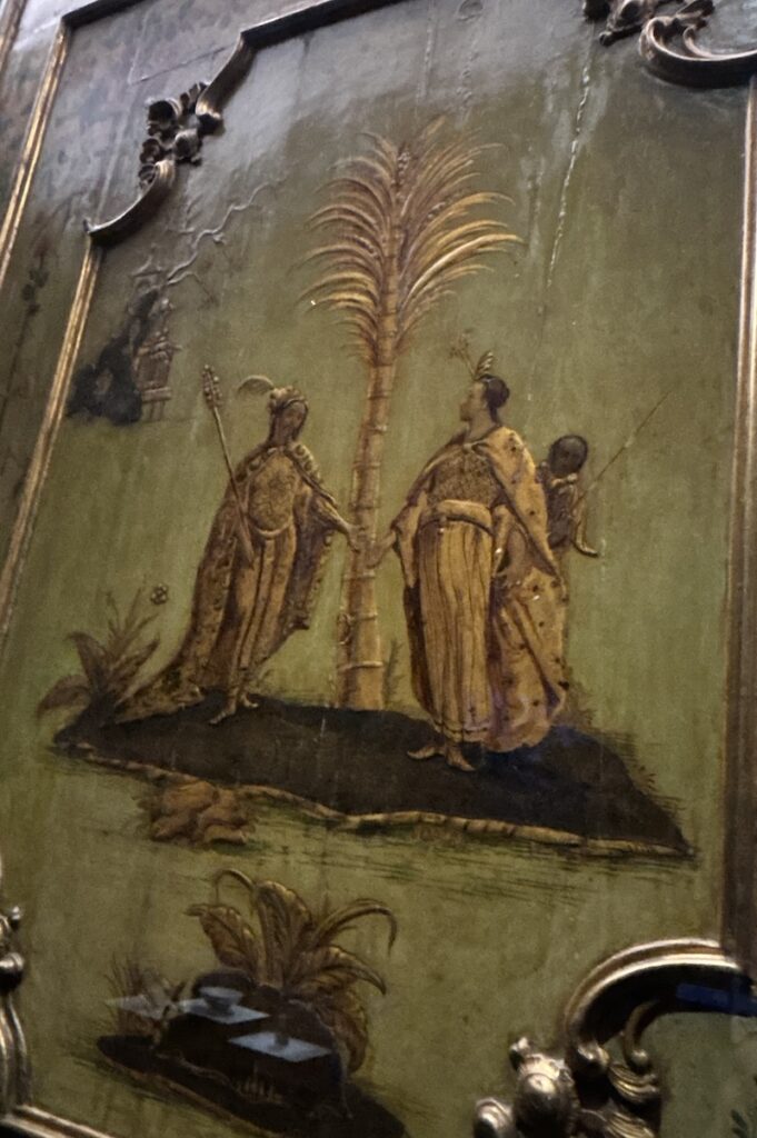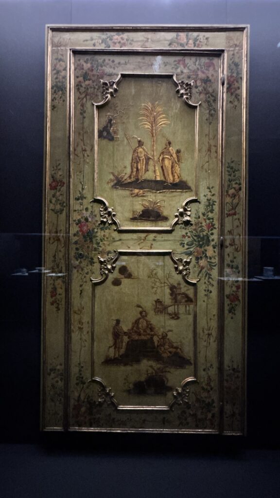 整個展覽最巨型的必定是來自威尼斯的金漆木門。門上門下繪畫了中東中亞服飾的人物,他們身邊有芭蕉樹,也有類似中式亭台樓閣的建築物。這些是當時西歐對於遠東的想像體驗。