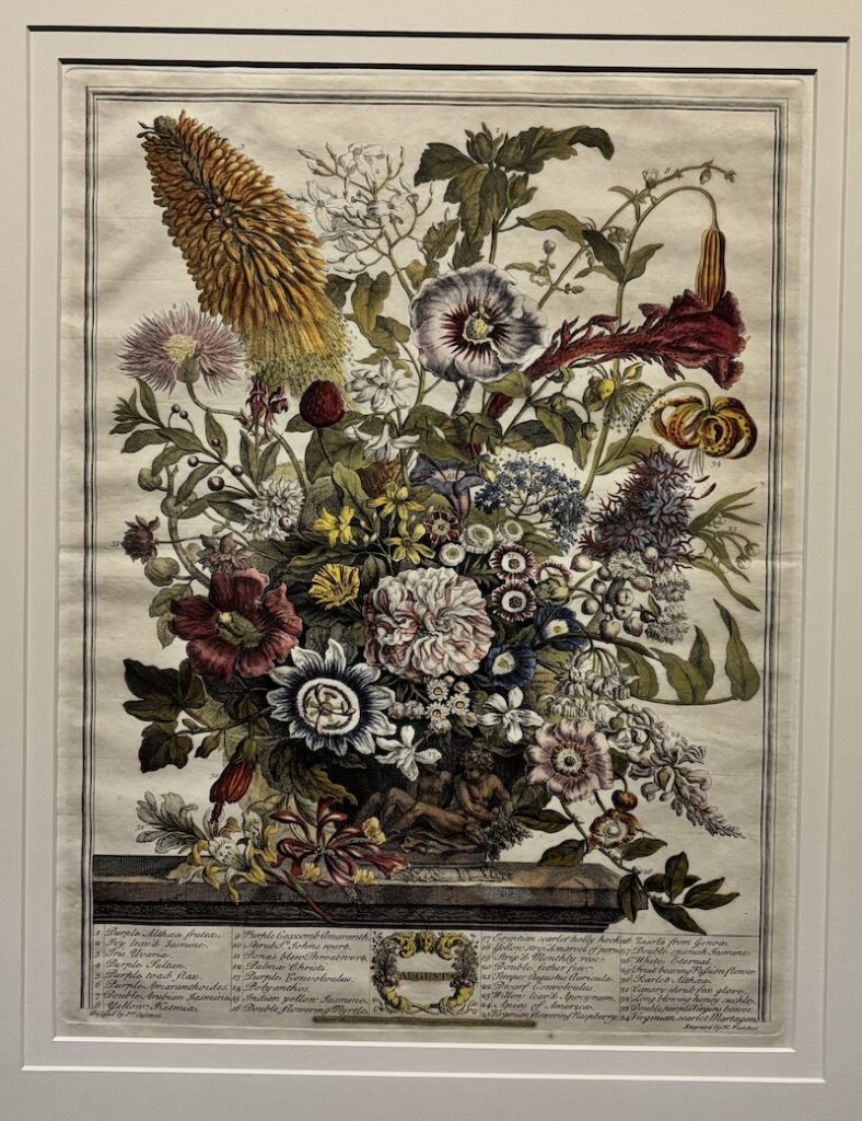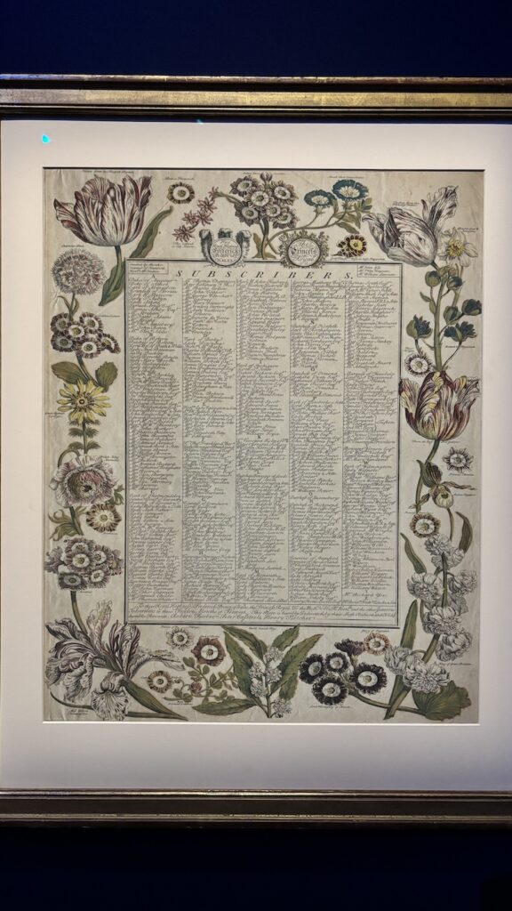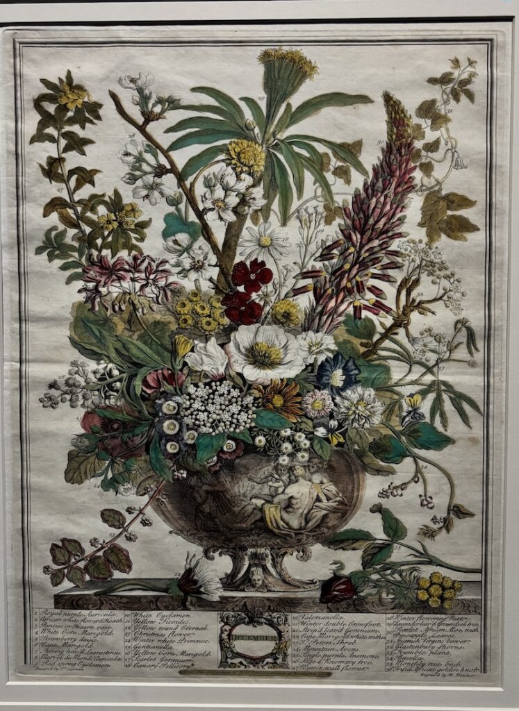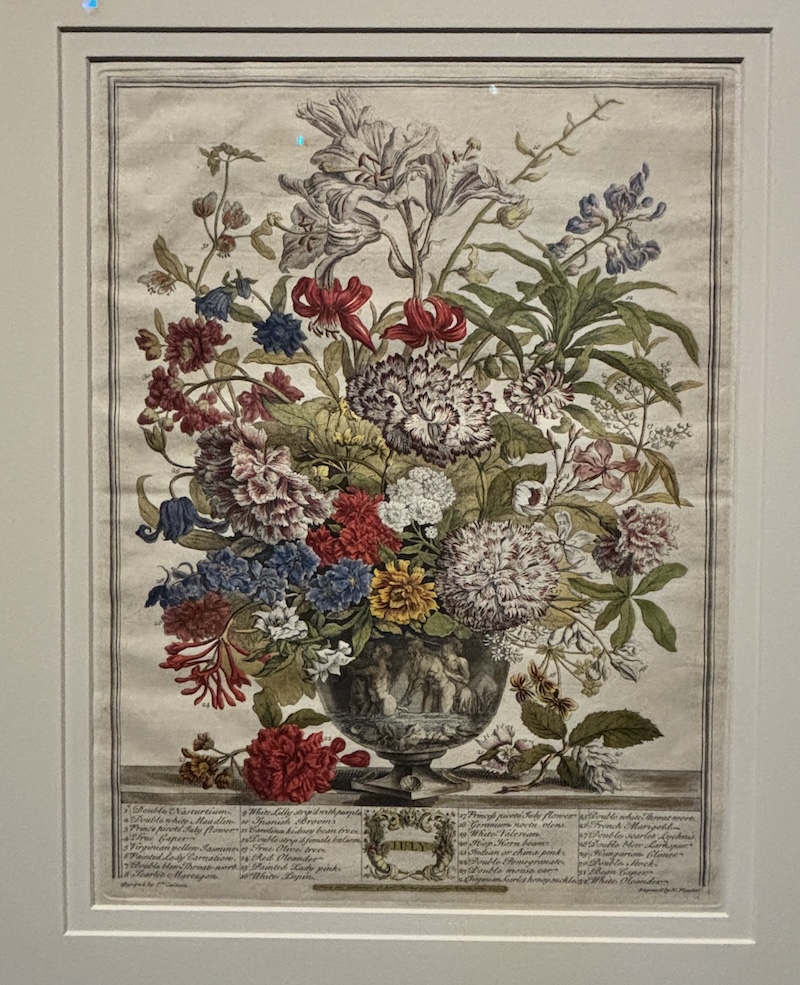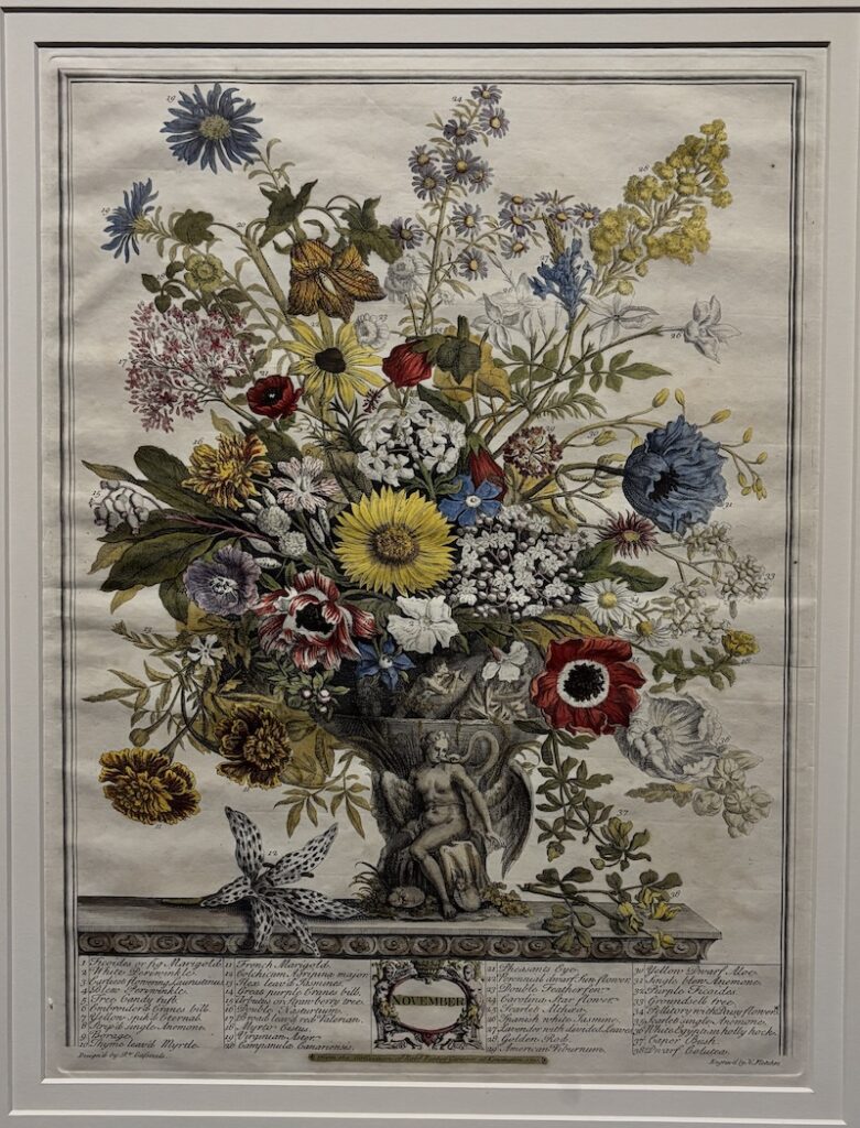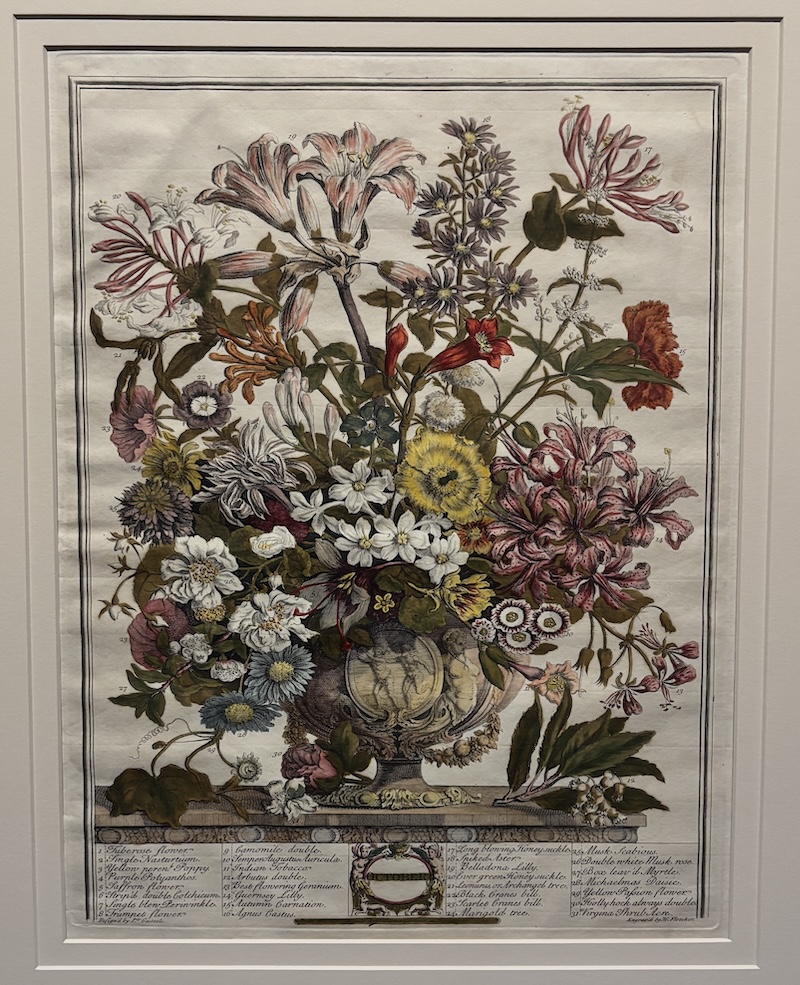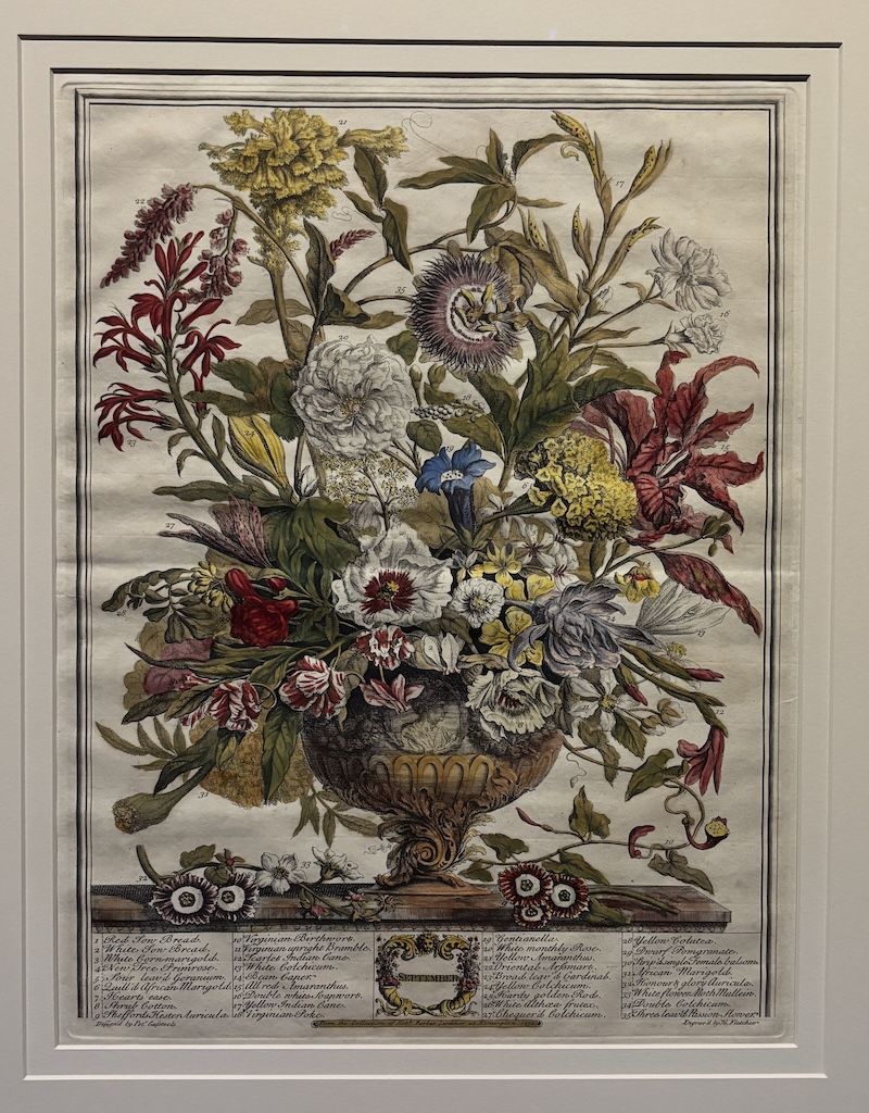 英國十八世紀推出的首本商業性植物圖錄,全套共十二幅版畫以手繪上色,每幅描繪了當月盛開的三十多種花卉,頁底羅列物種清單,當中不少是外來品種。圖錄巧妙地將靜物畫轉化為苗圃的行銷工具,提供園藝資訊及視覺參考。